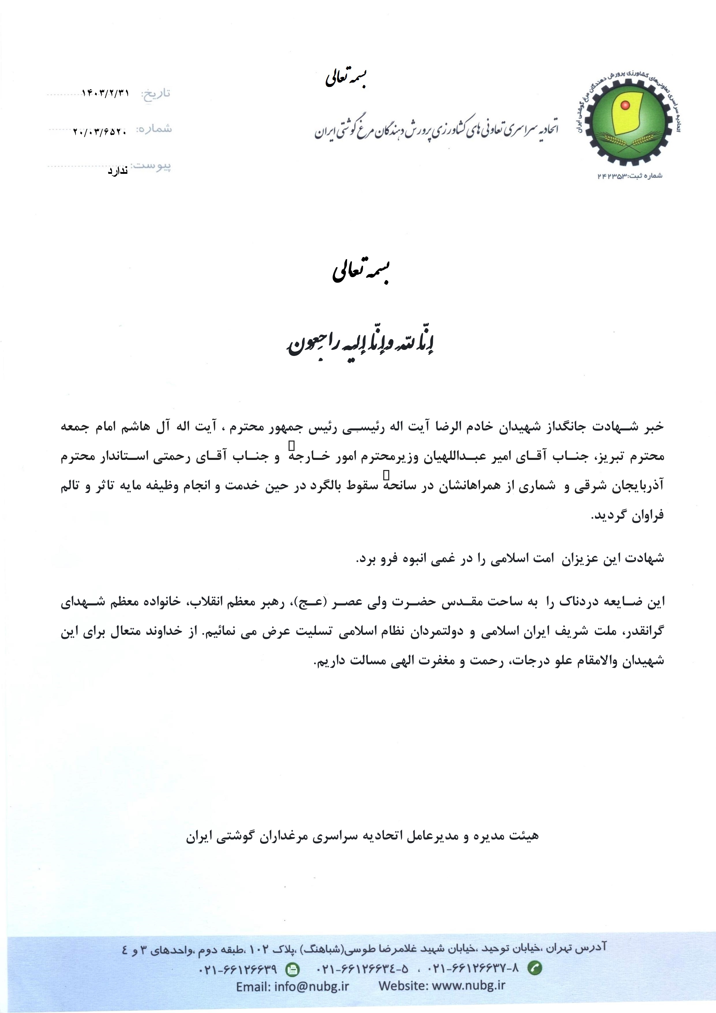 پیام تسلیت اتحادیه سراسری مرغداران گوشتی ایران در پی شهادت رئیس جمهور و هیئت همراه…